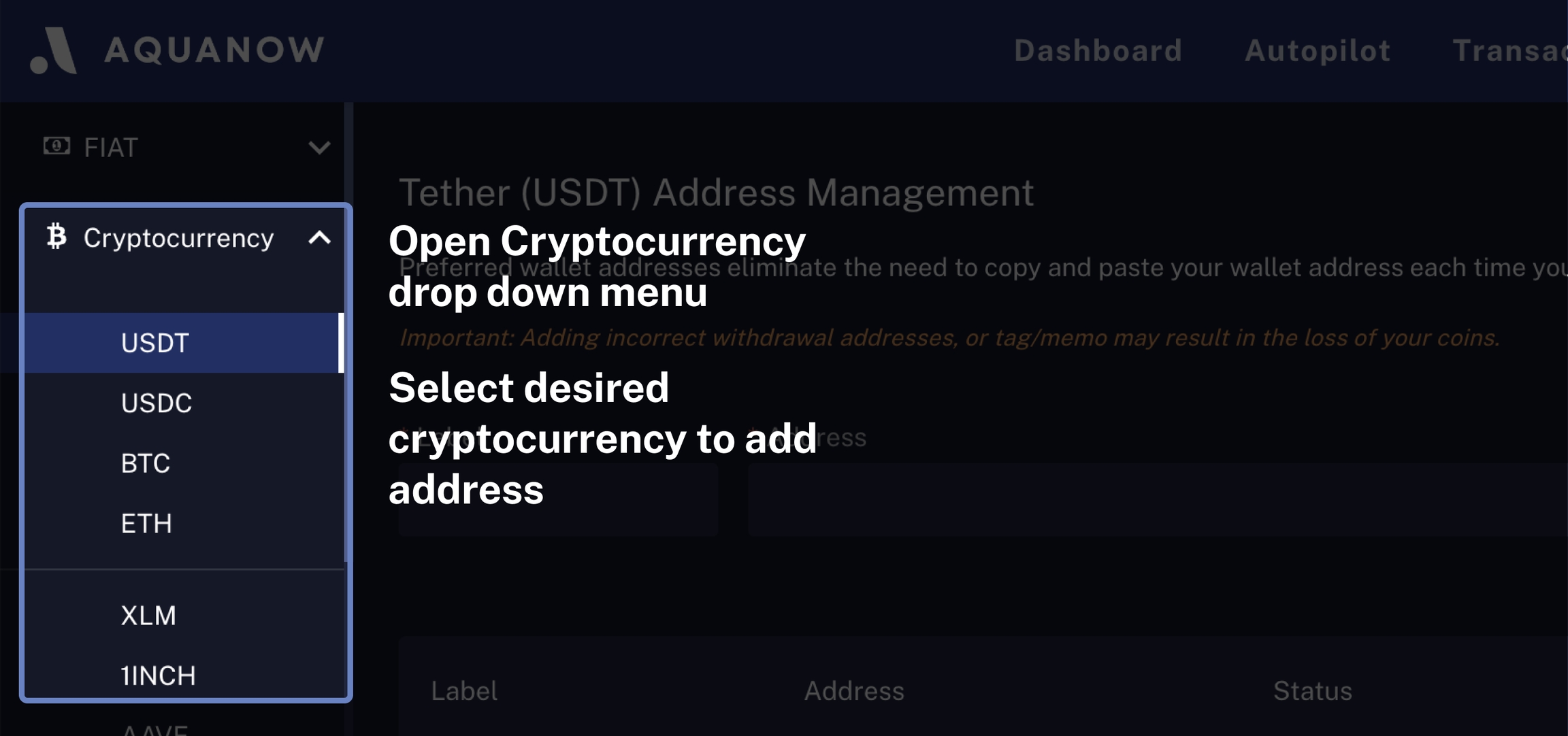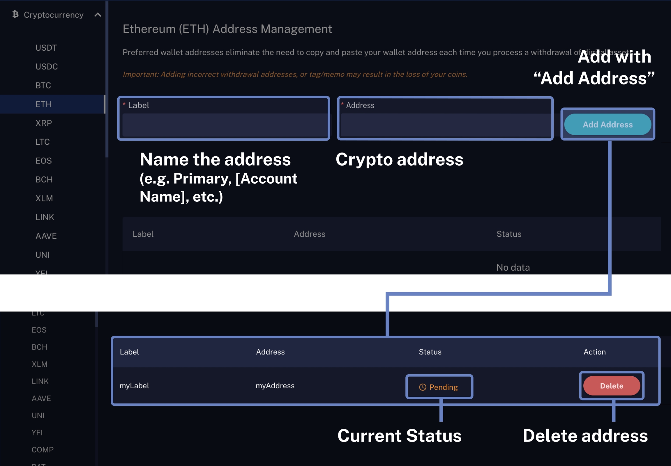 Enter the name and the crypto address you wish to whitelist in the "Label" and "Address" section, then select "Add Address".