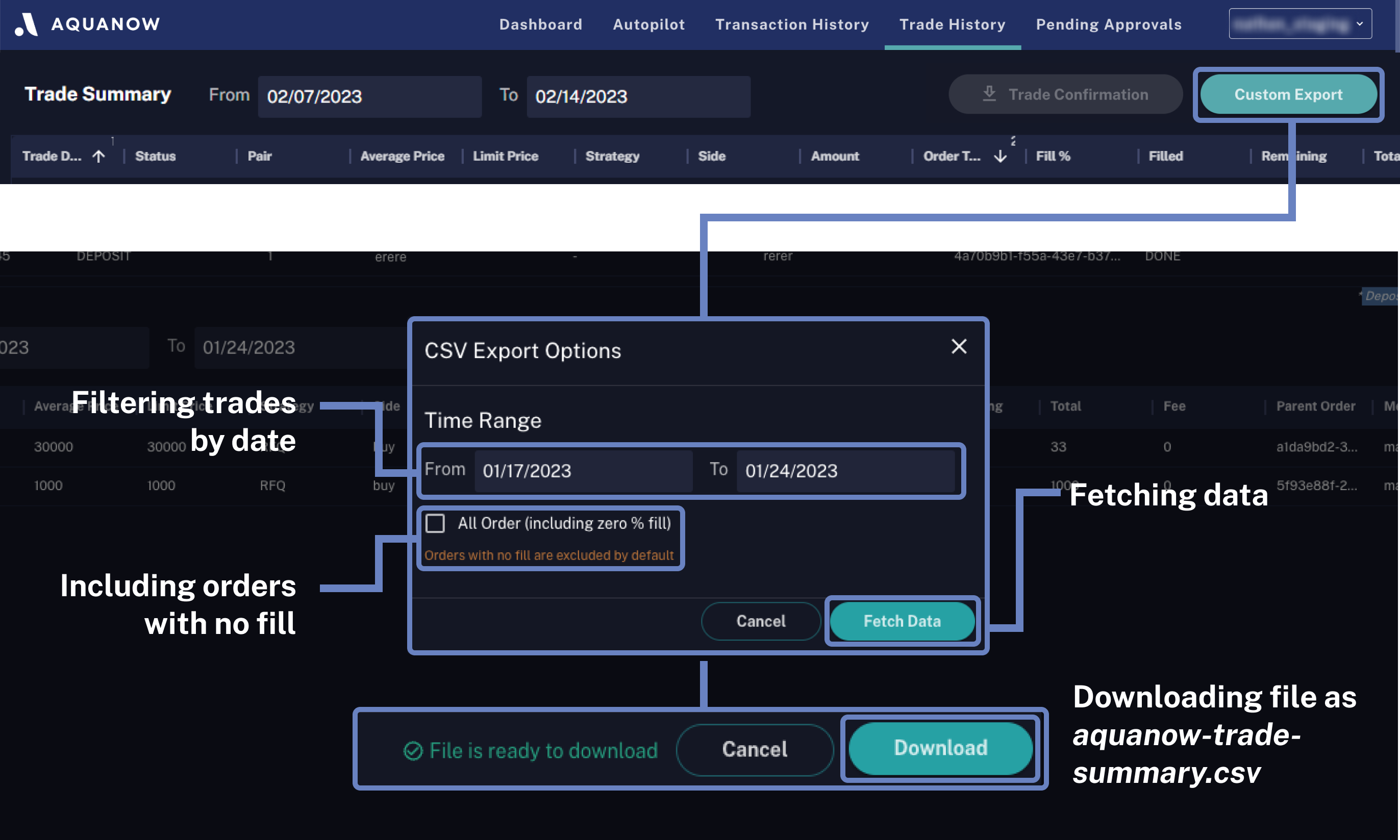 The file will be downloaded as *aquanow-trade-summary.csv*.