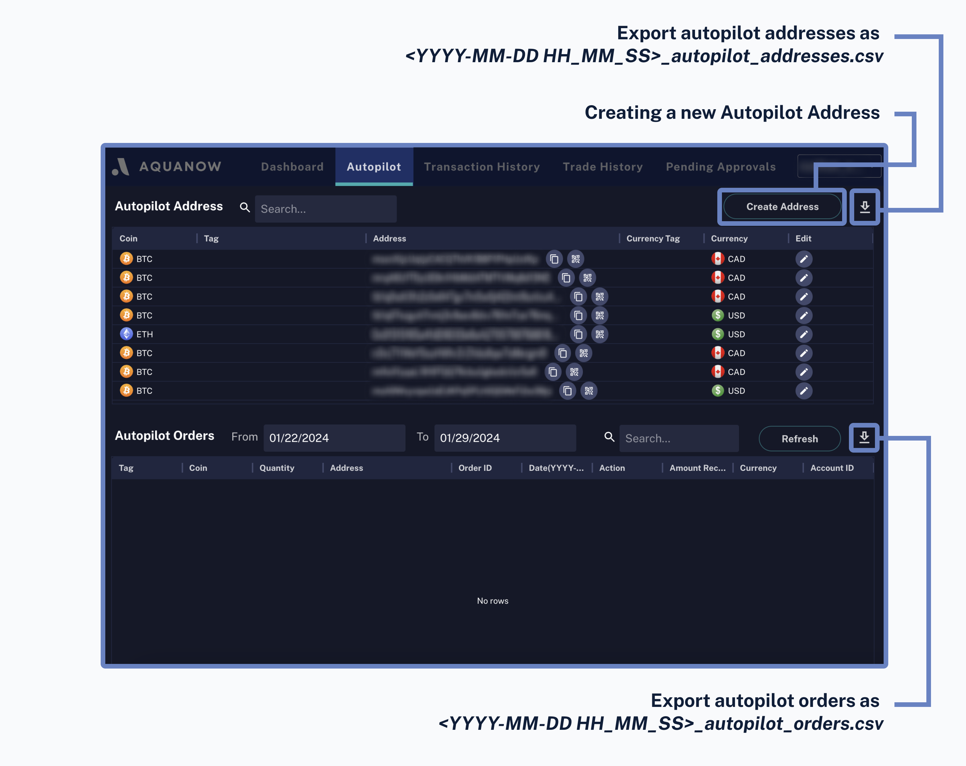 The displayed Autopilot addresses for each coin can be exported as needed. Exports for autopilot addresses will be formatted as:&#x20;