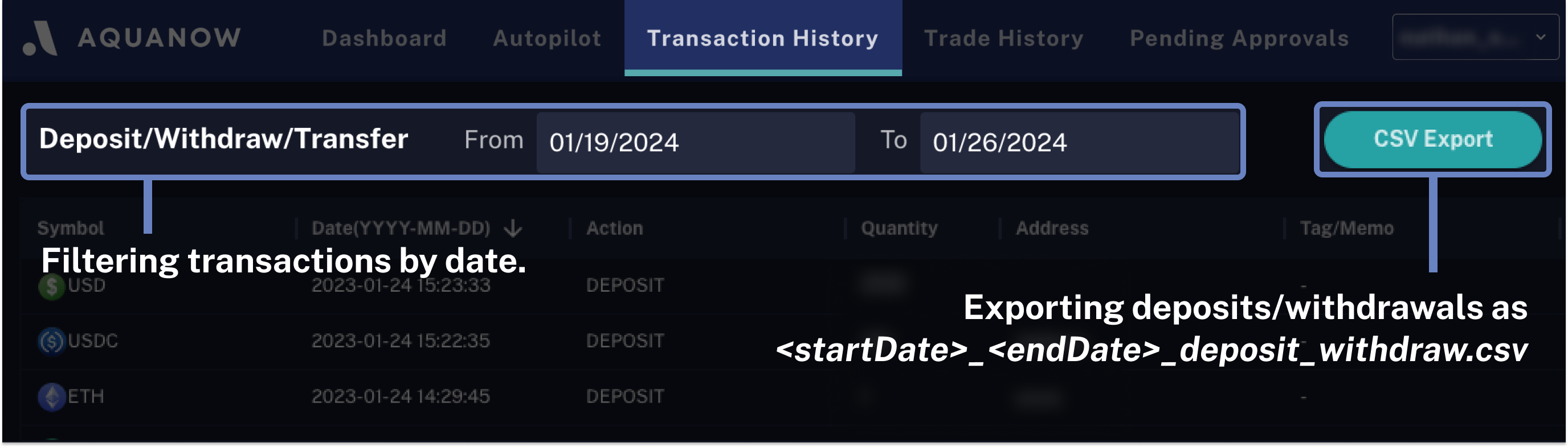 The user can then select 'CSV Export' to initiate the CSV download. The file will be downloaded as *\<startDate>\_\<endDate>\_deposit\_withdraw\.csv*