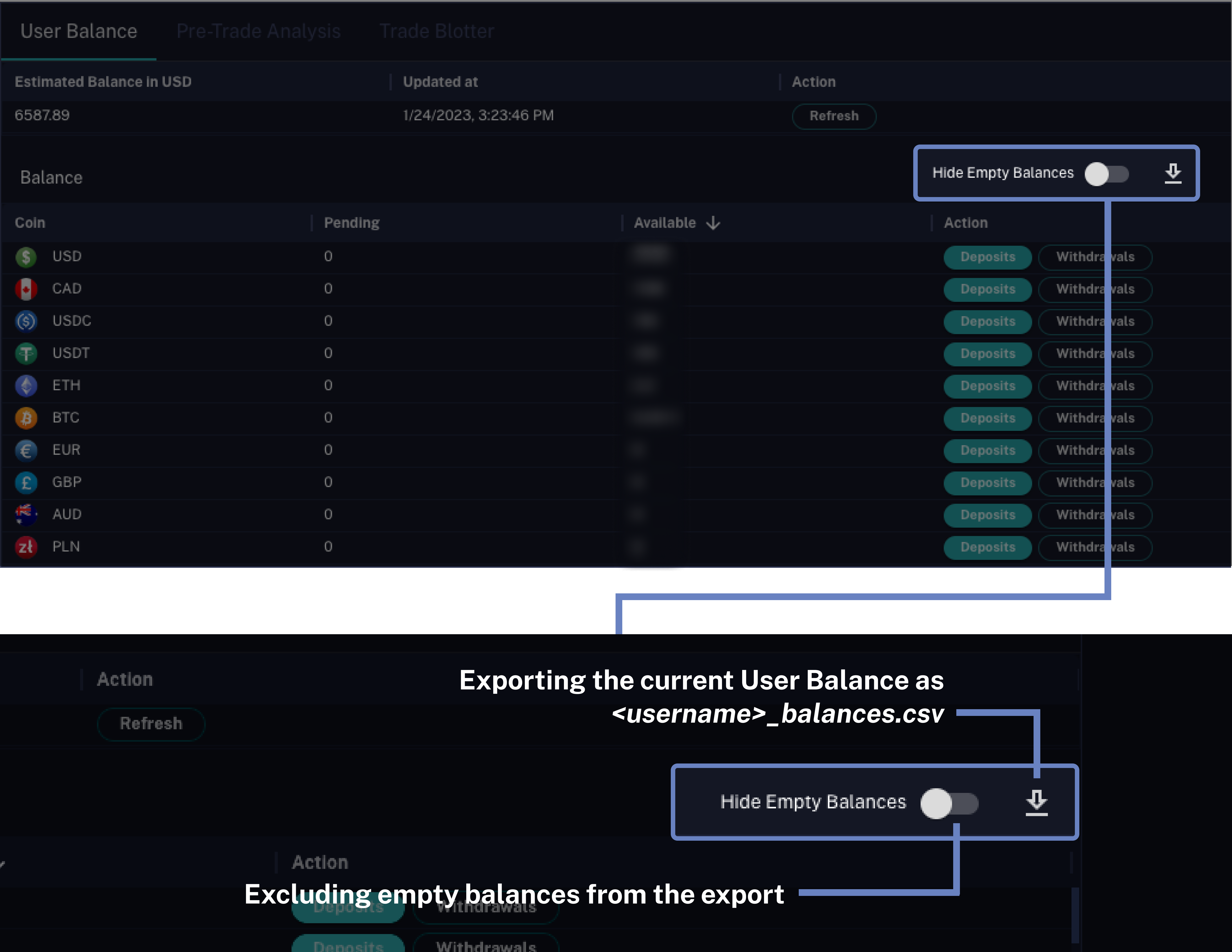 Select the top right download button in the User Balance section to download account's table data in CSV form.&#x20;