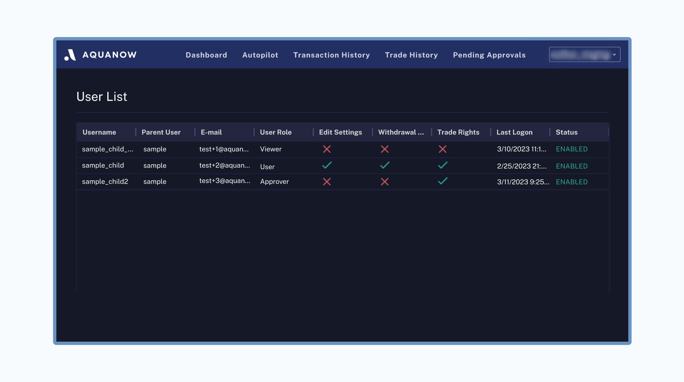 We can support users in defining user access levels and permissions to give you autonomy of how you want to use Aquanow's platform. As needed, multiple users can gain access to making deposits/withdrawals, and executing trades.