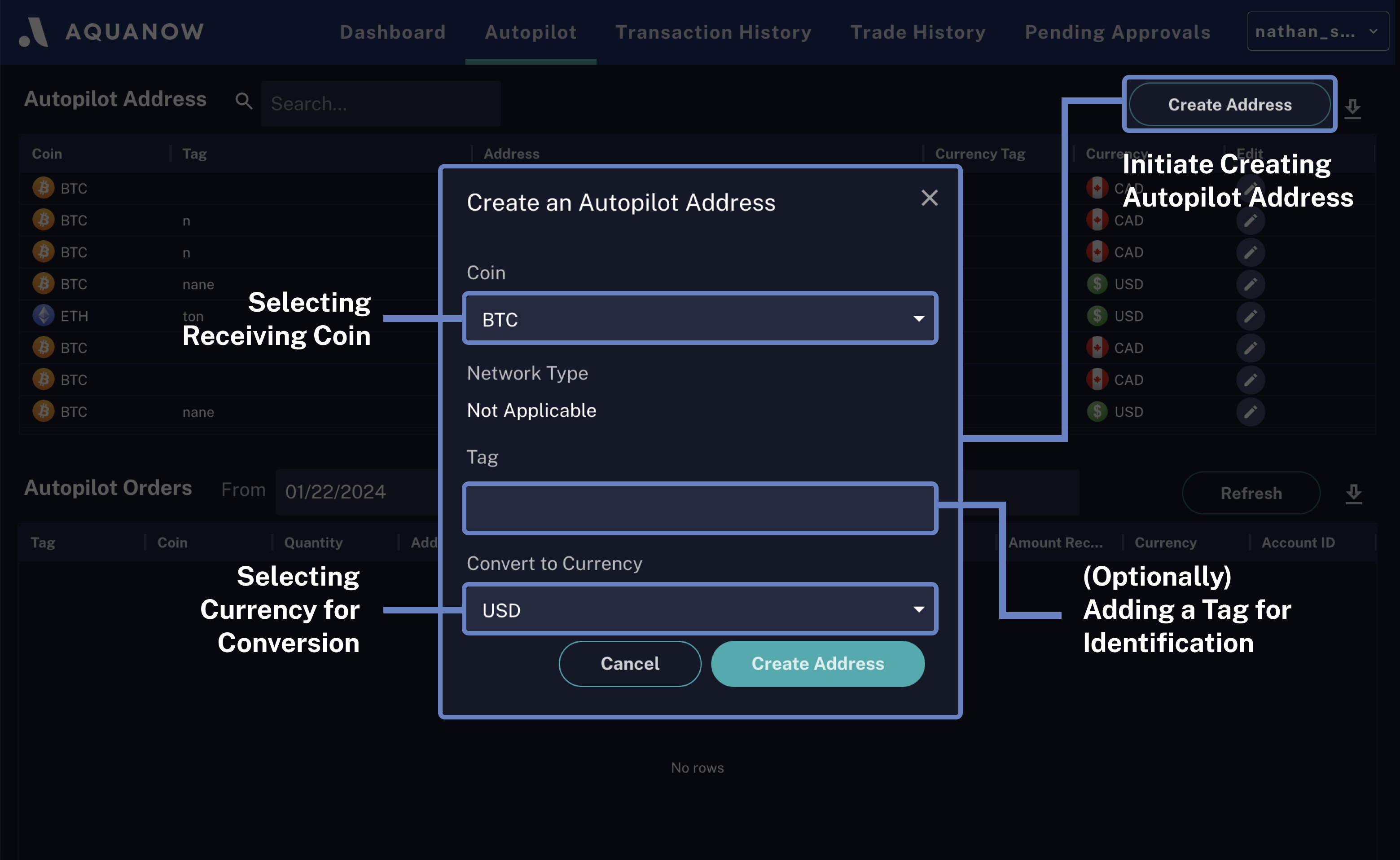 Autopilot Addresses can be added from the Autopilot tab as well. Once the user clicks "Create Address", they'll be prompted to enter the receiving coin, the converting currency, and optionally a tag to help with identification.&#x20;