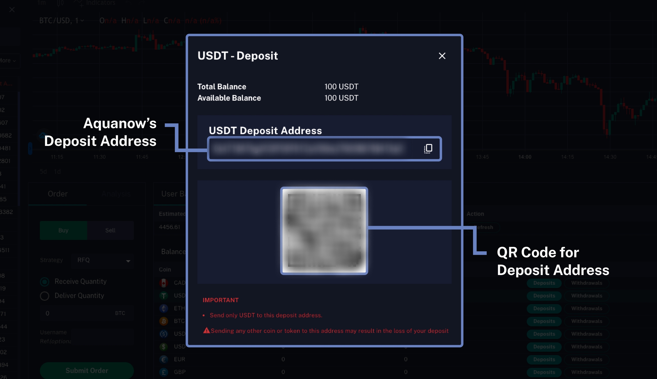 Once a deposit address is created, users can initiate a deposit by sending the correct coin to the displayed deposit address using the address or the QR code.