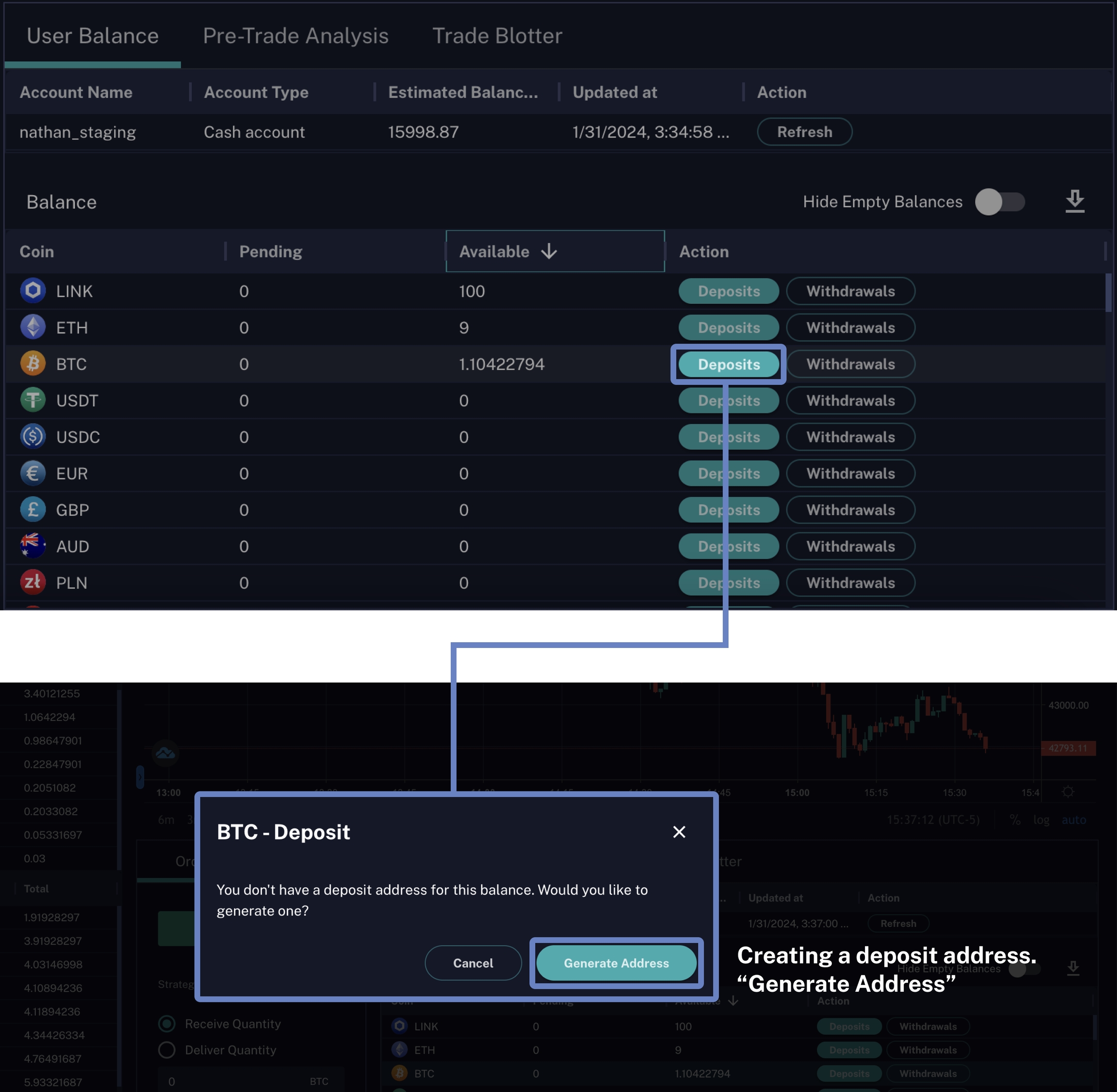 To initiate deposits, first select the Deposits action for a coin. Users without a deposit address will be prompted to generate an address first.