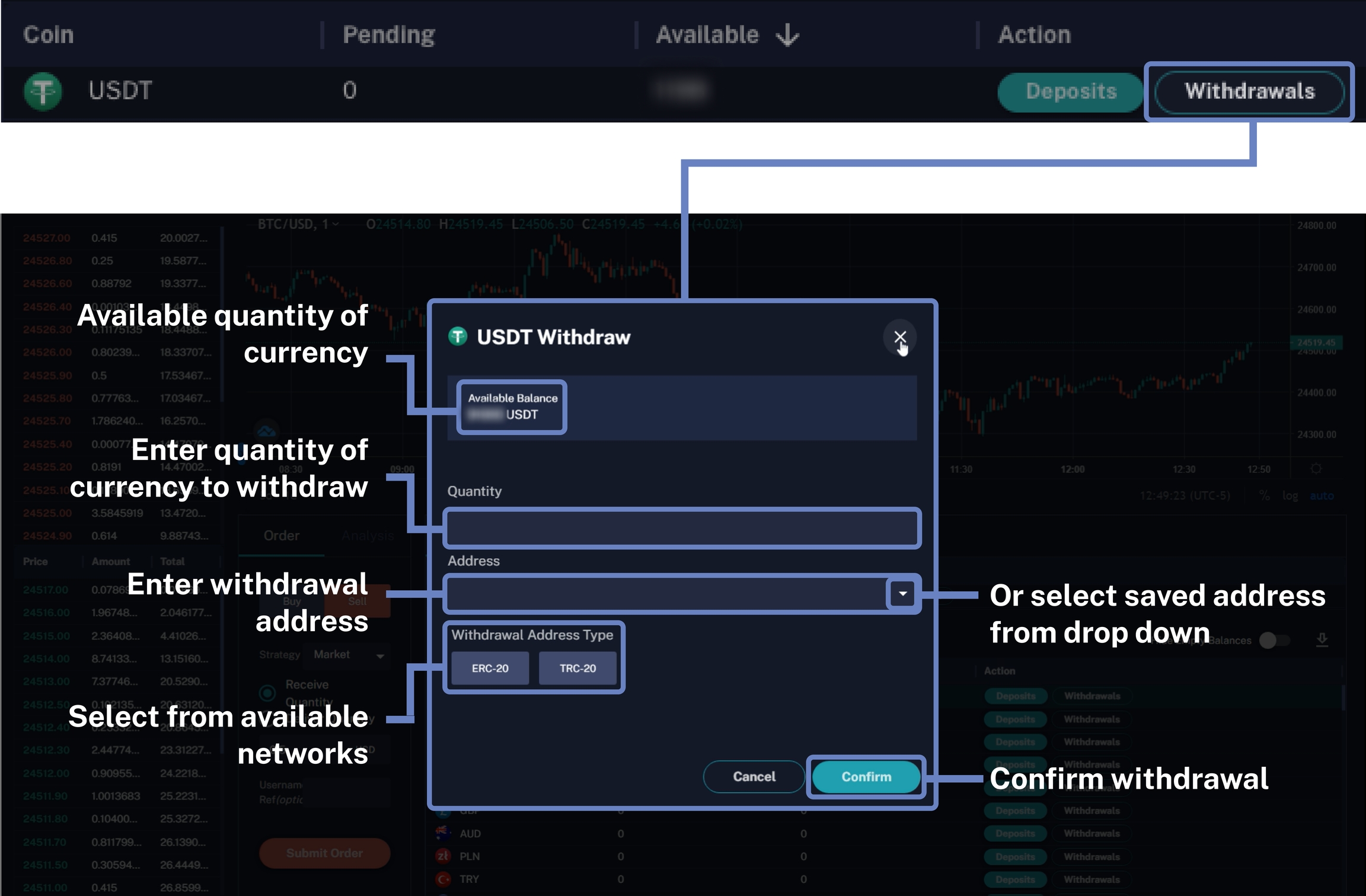 To initiate withdrawals, first select the Withdrawals action for a coin. Users can only withdraw up to the quantity of the available balance.