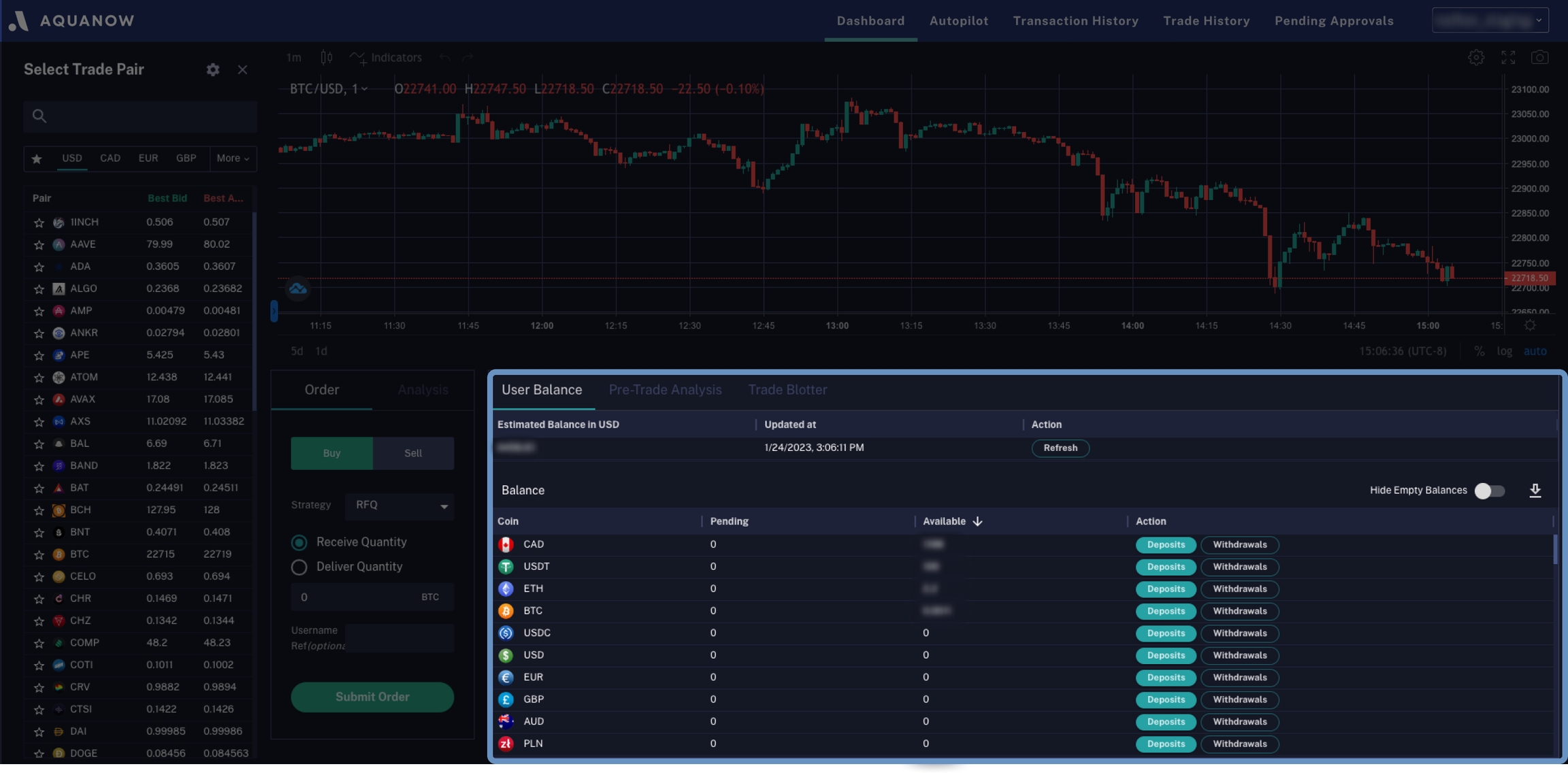 The User Balance section at the bottom right of the Dashboard displays crypto and fiat account balances. A toggle to hide zero balance rows can help users focus their asset list.