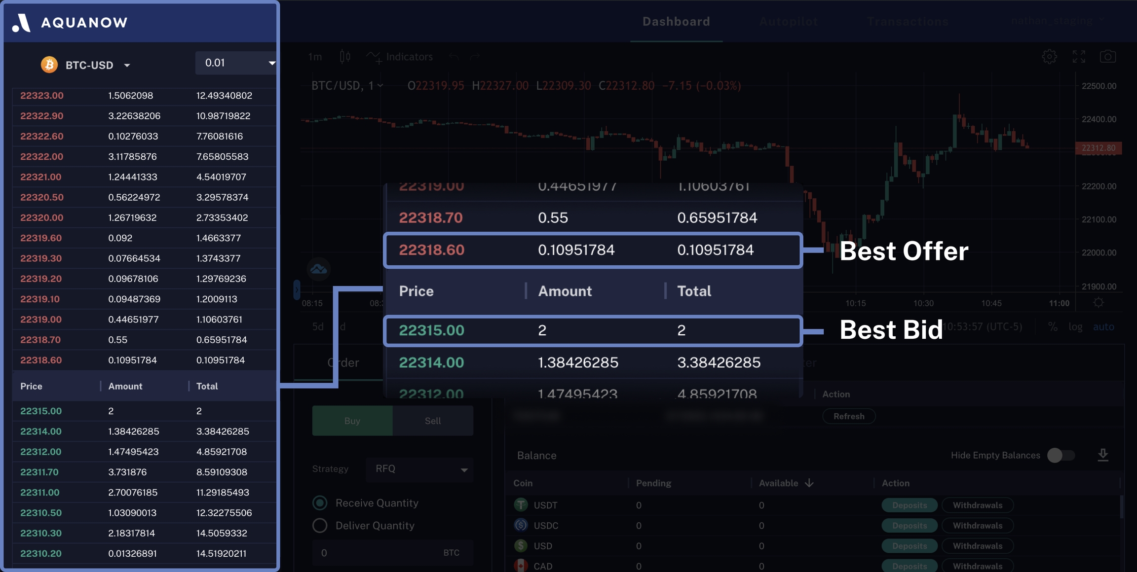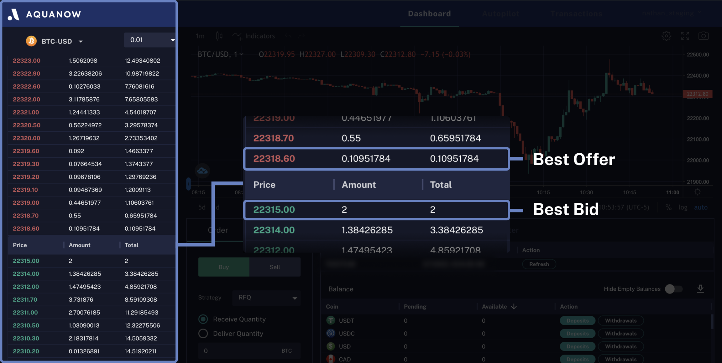 The left side of our main dashboard displays the order book for a selected trading pair.