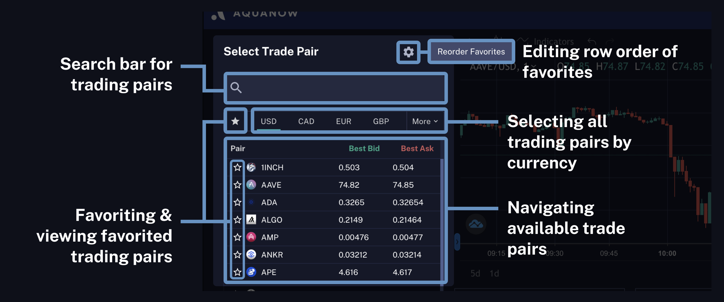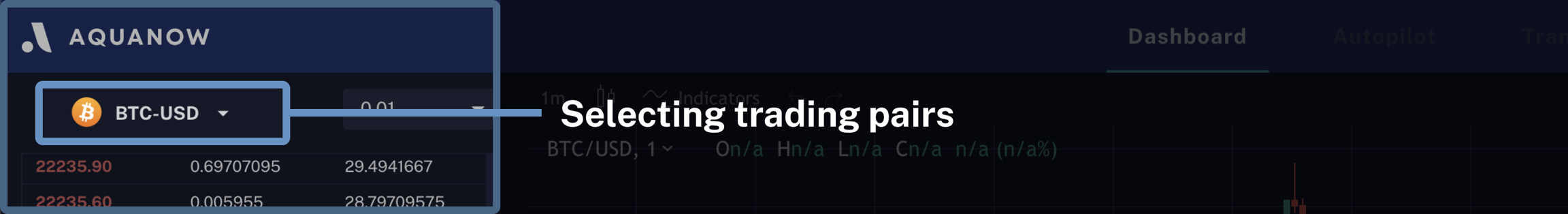 A drop-down menu above the order book allows users to enter or choose a trading pair from the available pairs list.