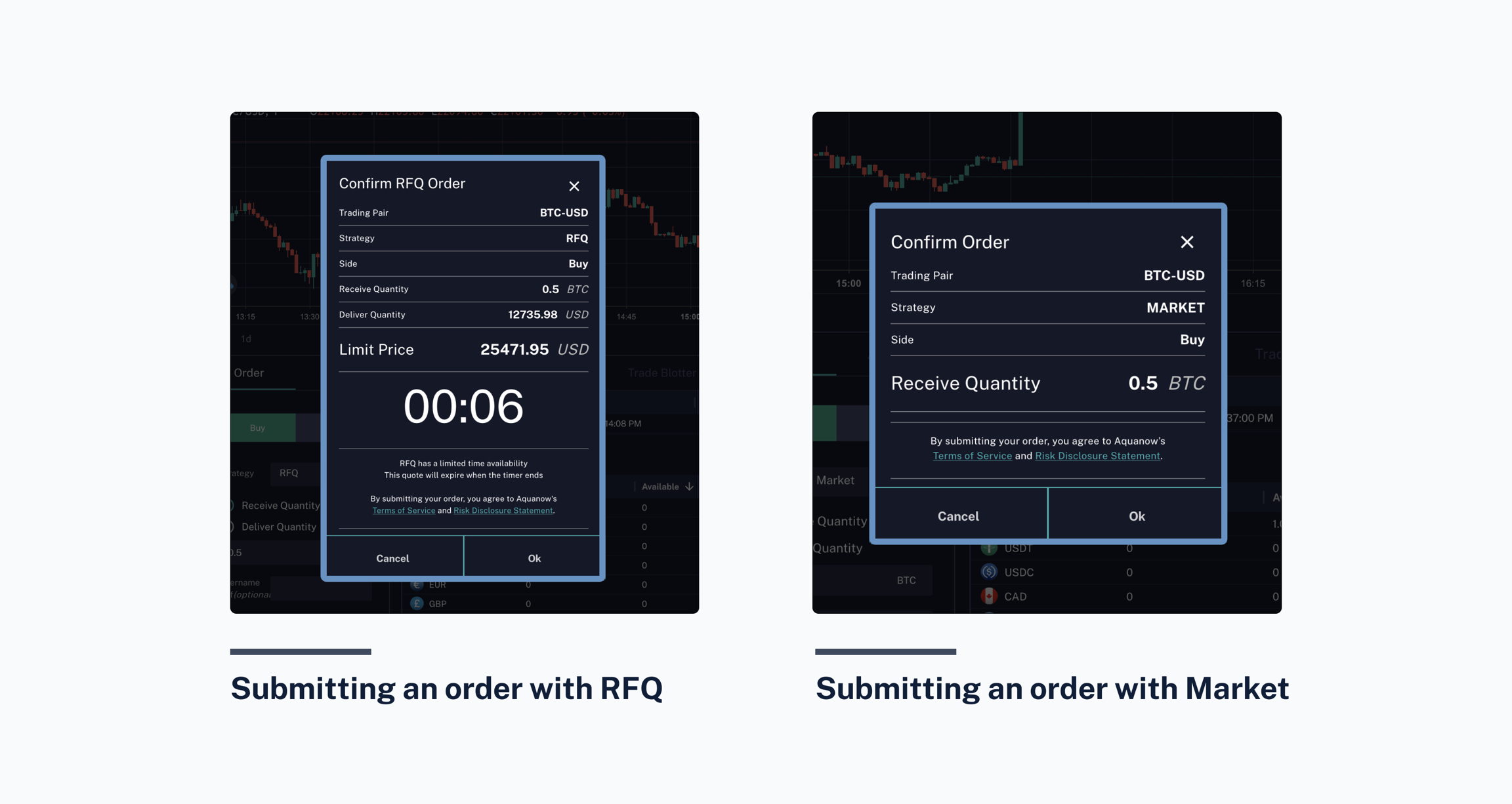 When submitting an Order, you will be prompted to confirm the request. A confirmation modal will highlight the critical order details, and you will have the option to submit or cancel the order request by clicking "Ok" or "Cancel" buttons. For RFQ orders, the modal also displays an 8 second quote timer. To submit the RFQ order you must click "Ok" before the quote expires, otherwise the order is considered expired.