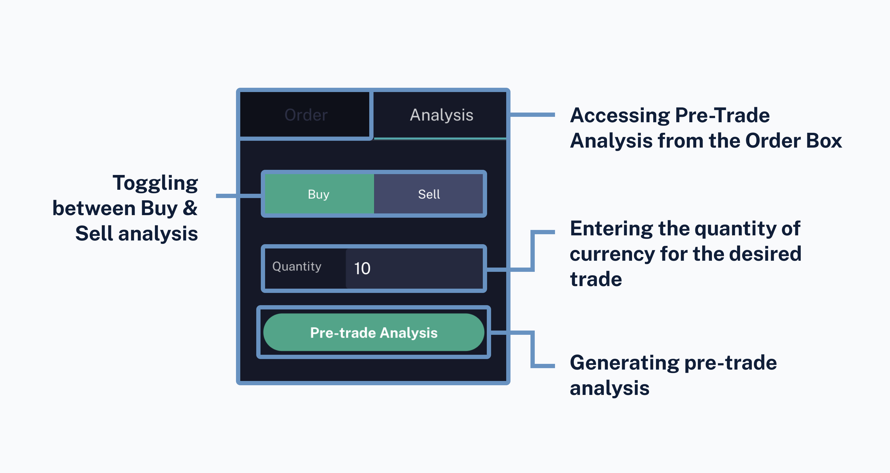 First, users will click the 'Analysis' tab from the order box. From there, users are prompted to select between Buy & Sell, enter the currency quantity of the order they'd like to place, then generate the pre-trade analysis.