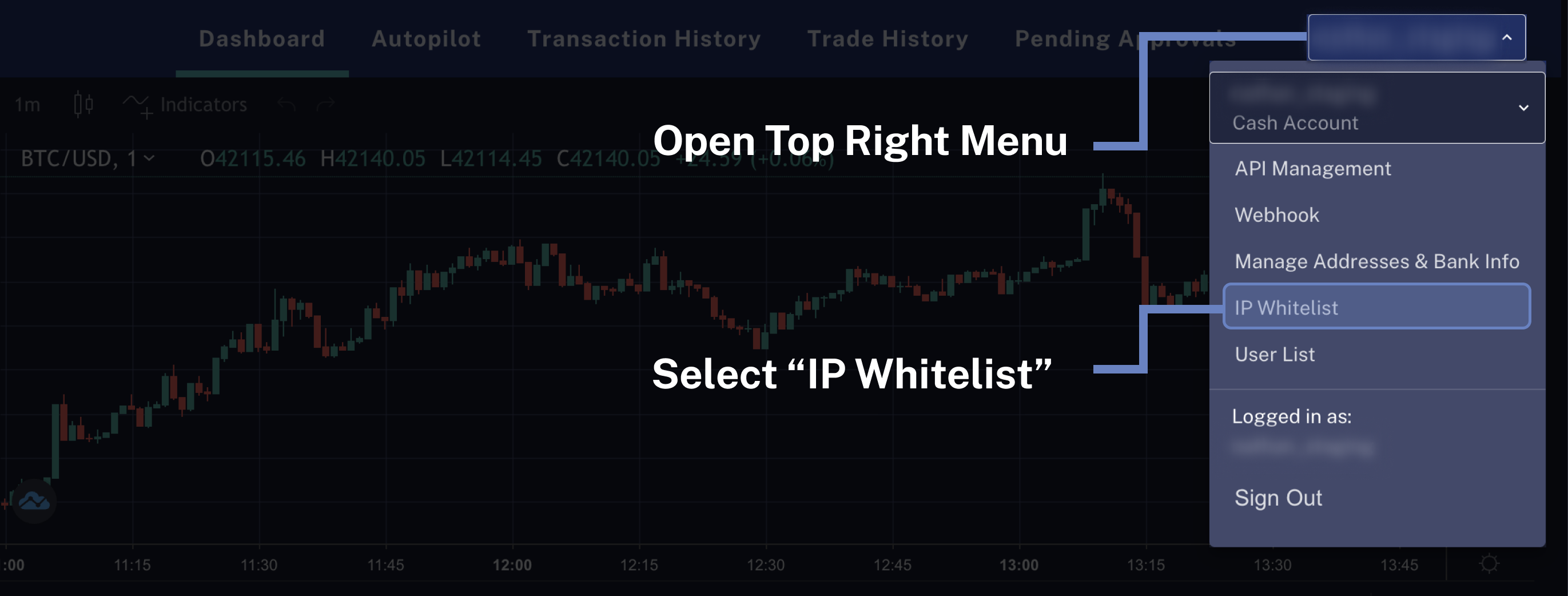 To access this, go to the user account dropdown at the top right corner of the screen and select "IP Whitelist".