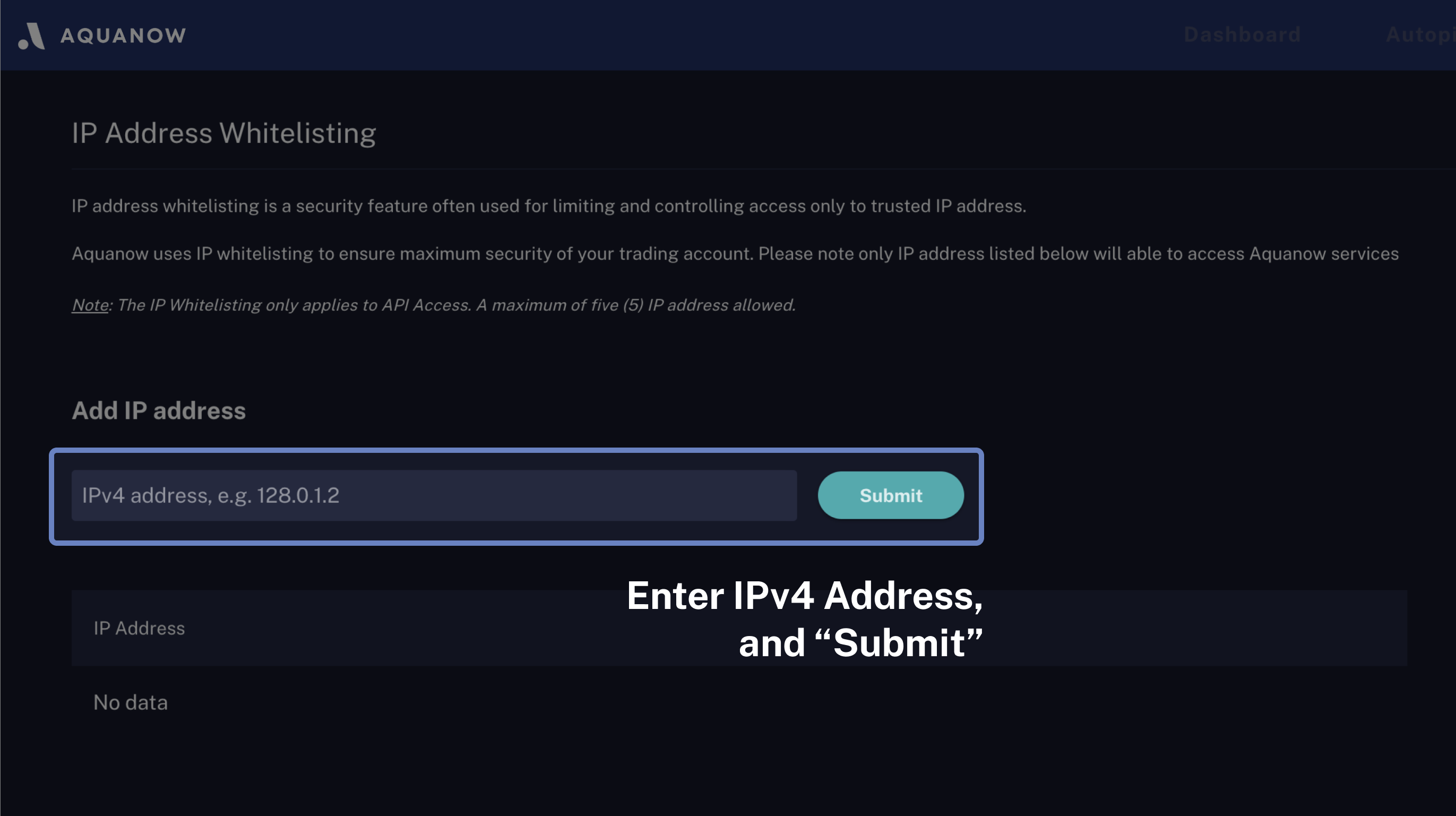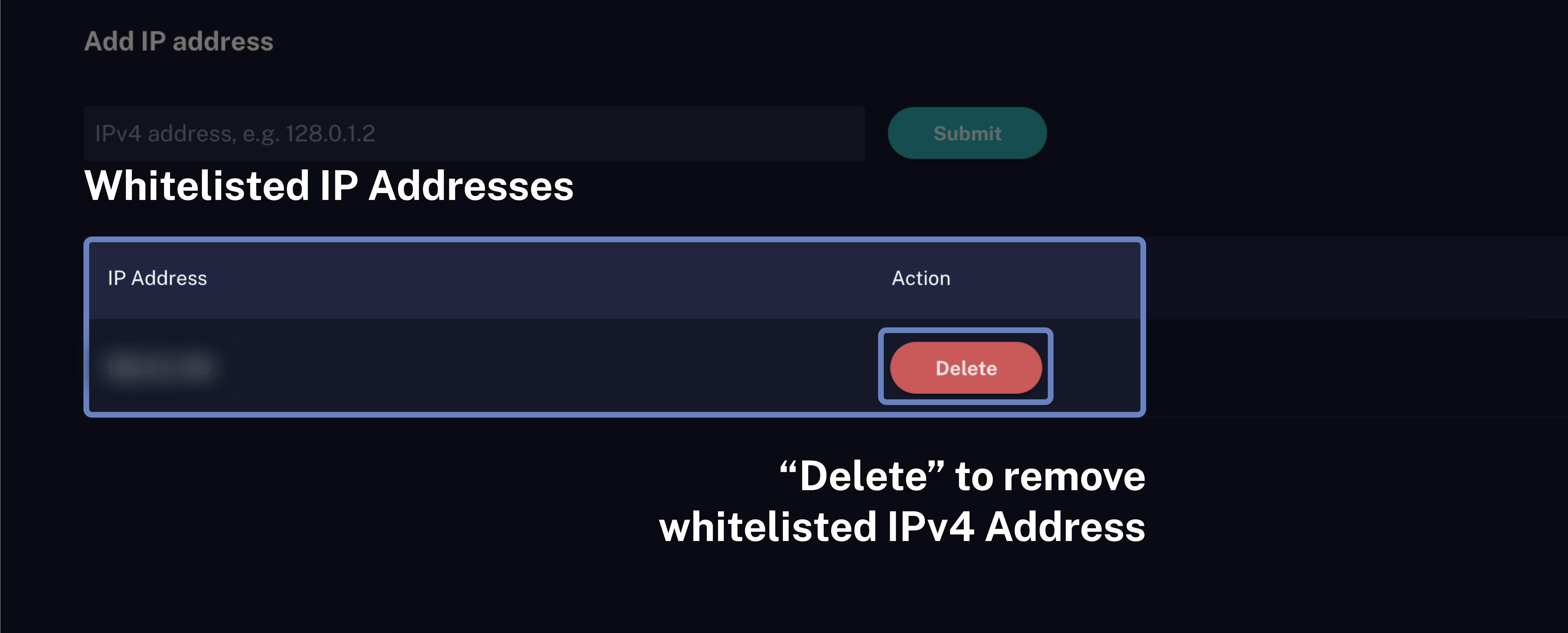 Enter the IP address you would like to whitelist in the "Add IP address" section and select 'Submit".