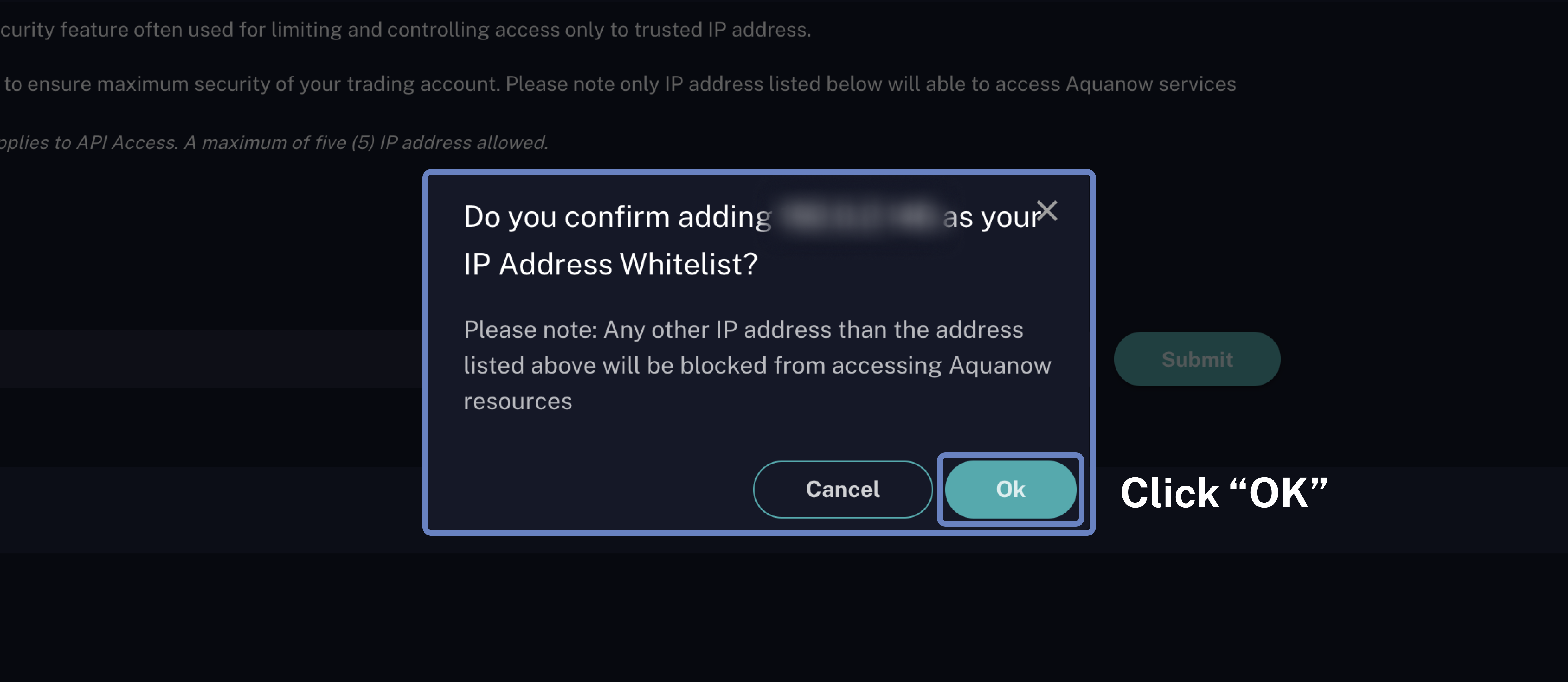 IP Whitelisting is a security feature to ensure maximum security of your Aquanow trading account. Using this feature, only IP addresses you specify will be able to access your account on our services.&#x20;