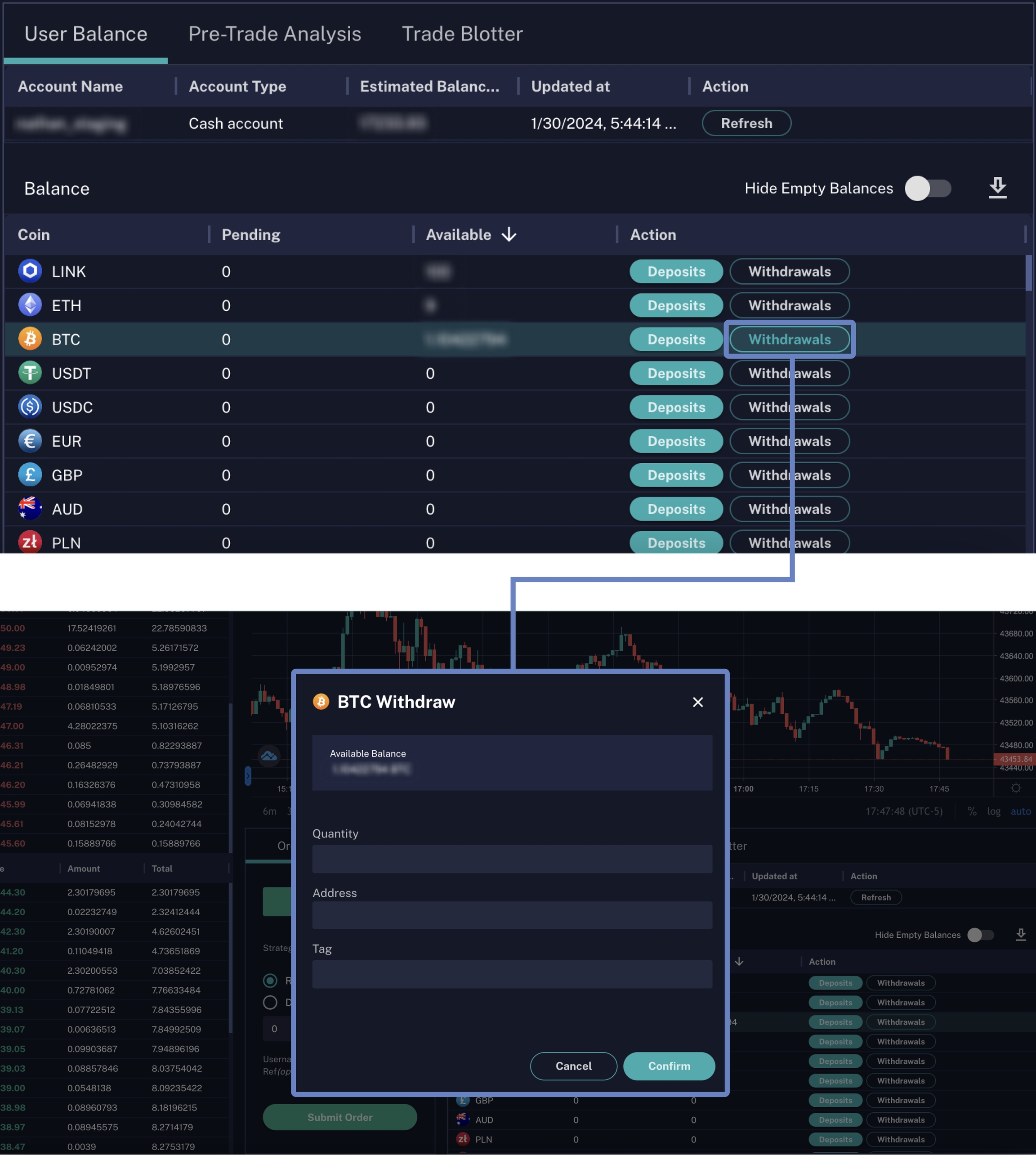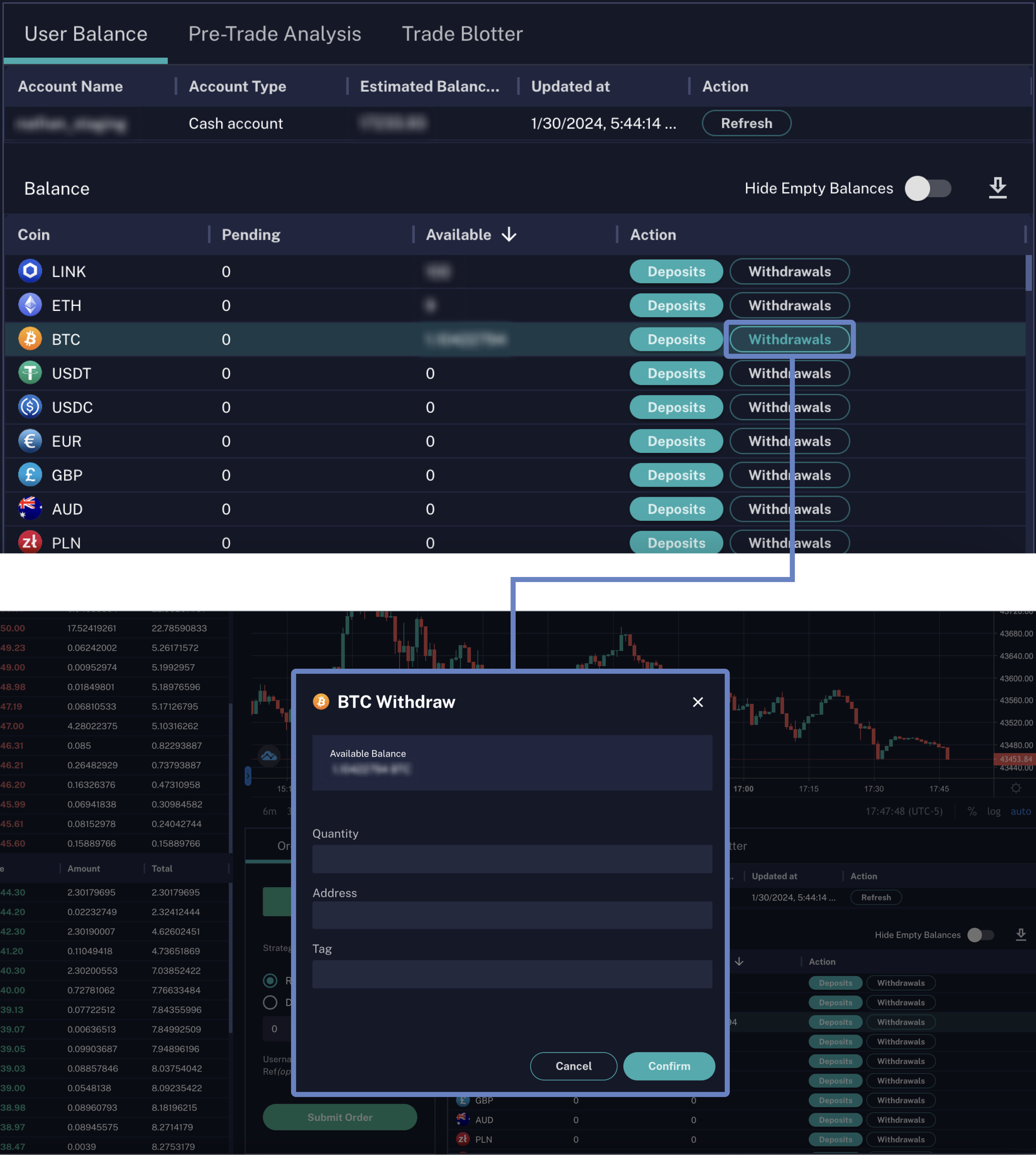 When a pending approval is approved, the request status is updated to "Approved" and the request begins processing. Afterwards, the trade/withdrawal can be viewed under the Trade/Transaction History tab, respectively.
