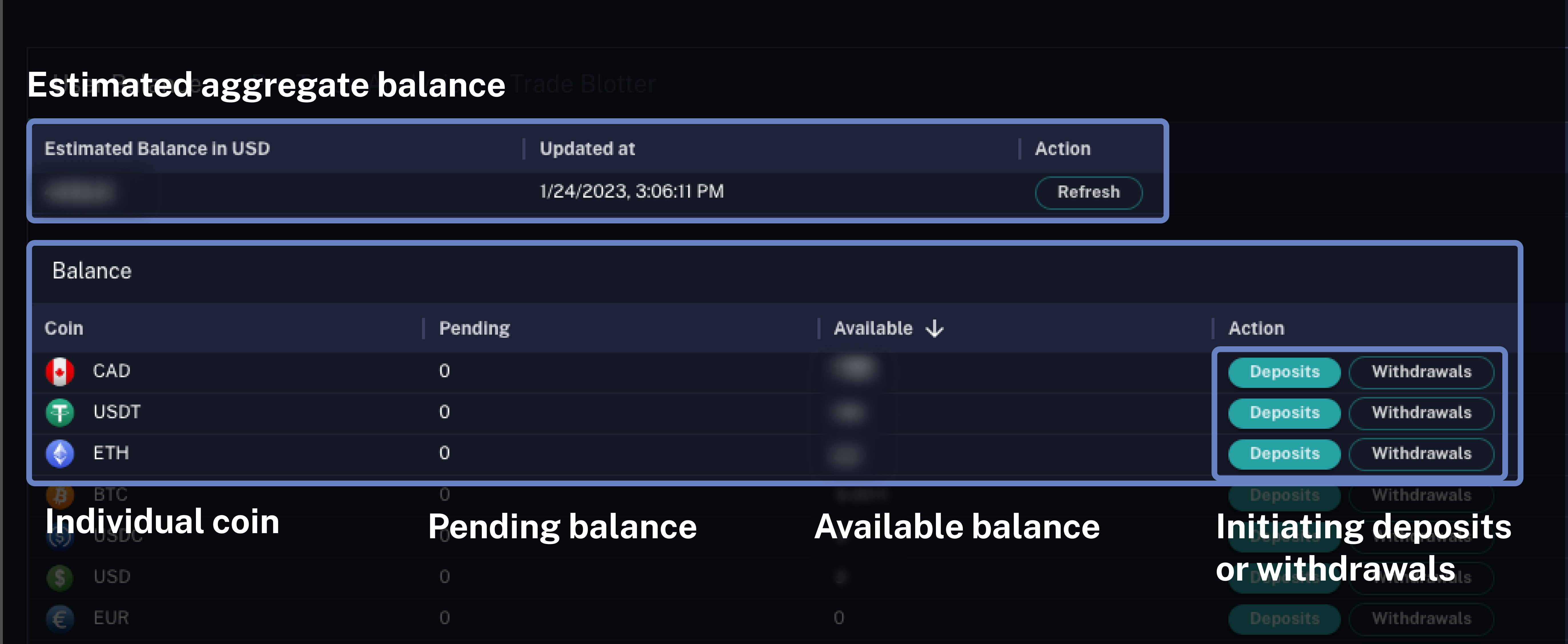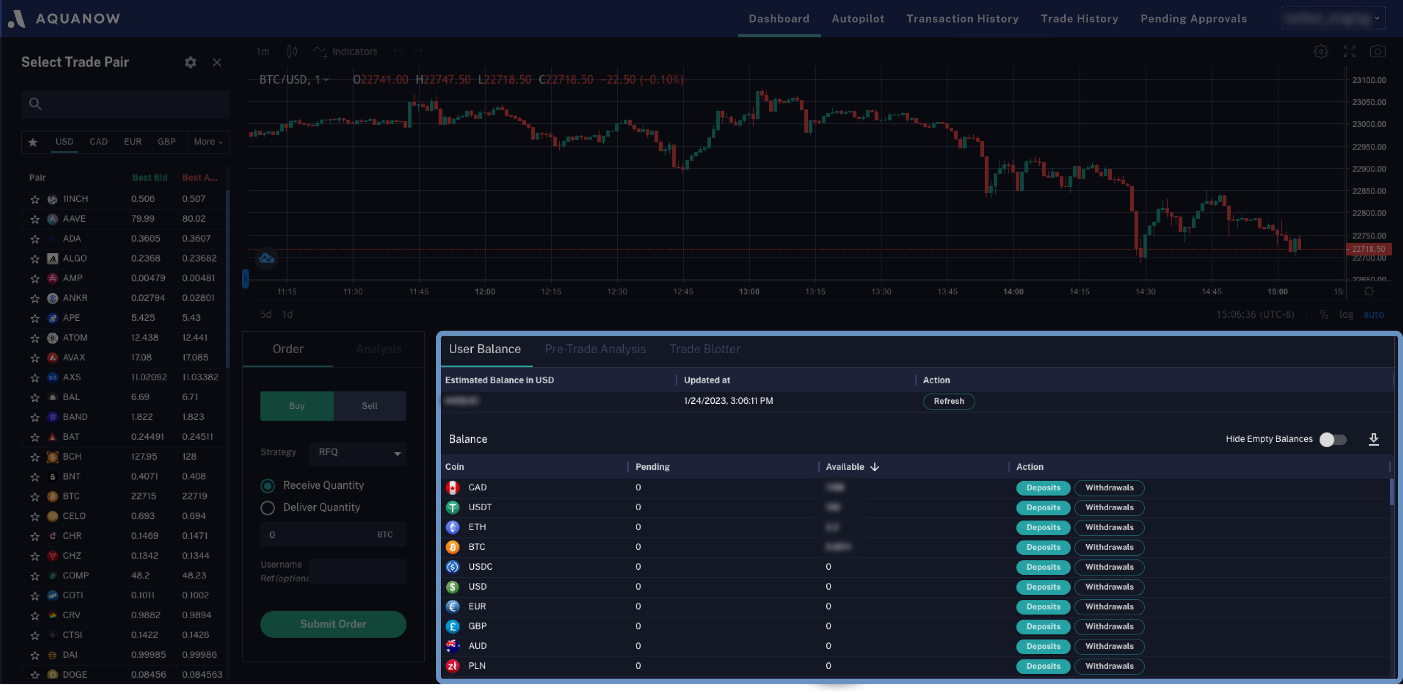 Within this section, user can also [**Initiate Deposits and Withdrawals**](https://docs.aquanow.io/aquanow/user-guide/deposits-and-withdrawals) **and** [**Export Balance CSVs**](https://docs.aquanow.io/aquanow/account-management/csv-exports#exporting-user-balances)**.**