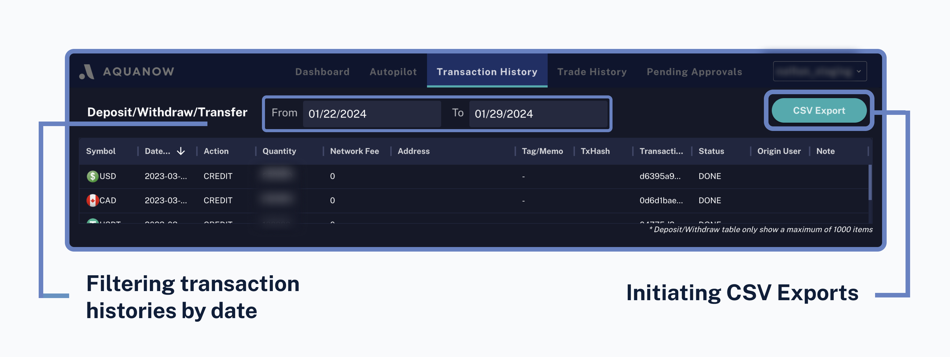 Users can also export these records as further outlined in the [CSV Exports](https://docs.aquanow.io/aquanow/user-guide/account-management/csv-exports) page.