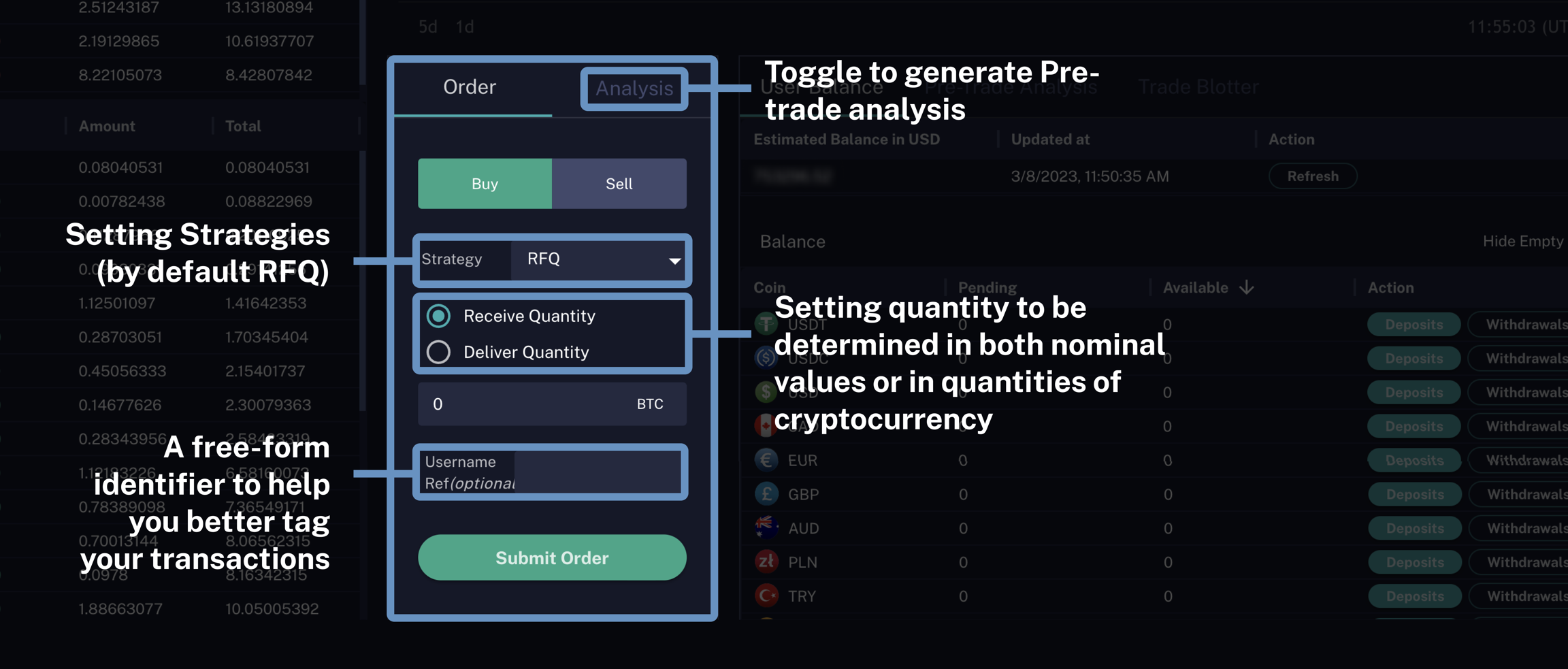 Users can also indicate whether they want to receive a specific quantity of the traded asset or whether they want to deliver a specific quantity of the traded asset by choosing the 'Receive Quantity' or 'Deliver Quantity' option (e.g. You can purchase X bitcoin with $25,000 USD OR you can purchase 1 bitcoin with X USD).