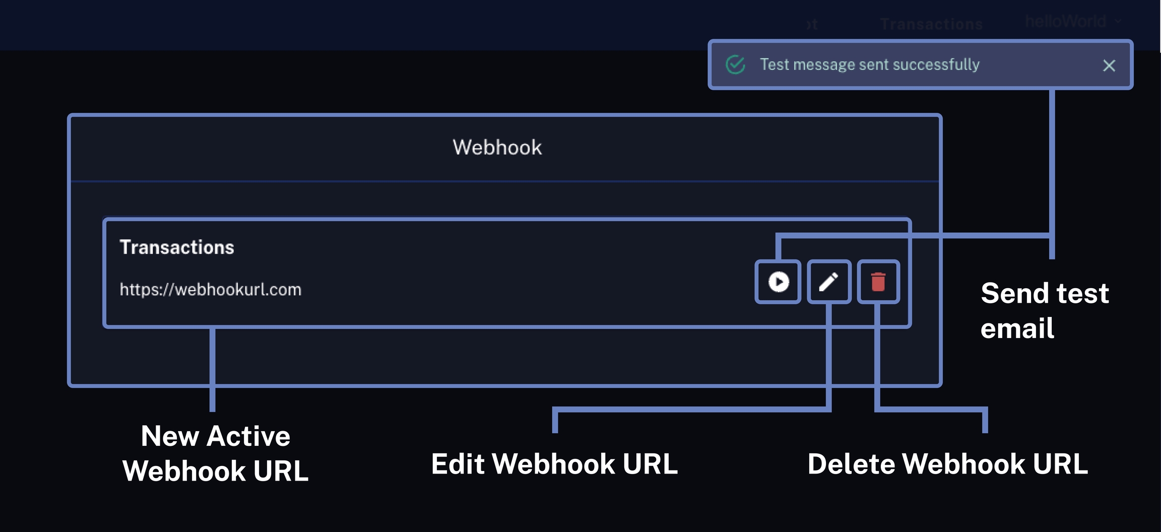 Once the Webhook is added, several actions become available: Users can send a test message, edit or delete the Webhook.