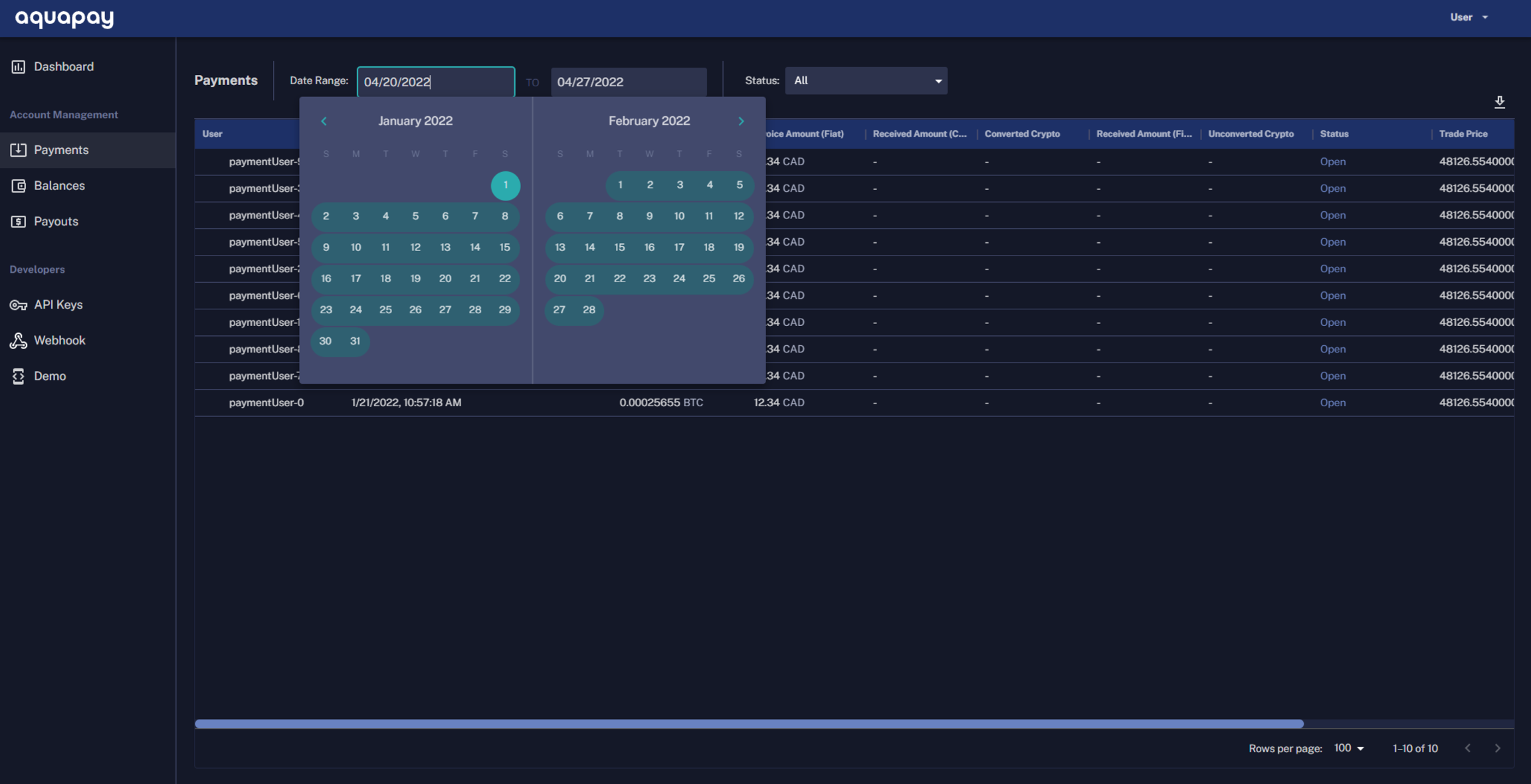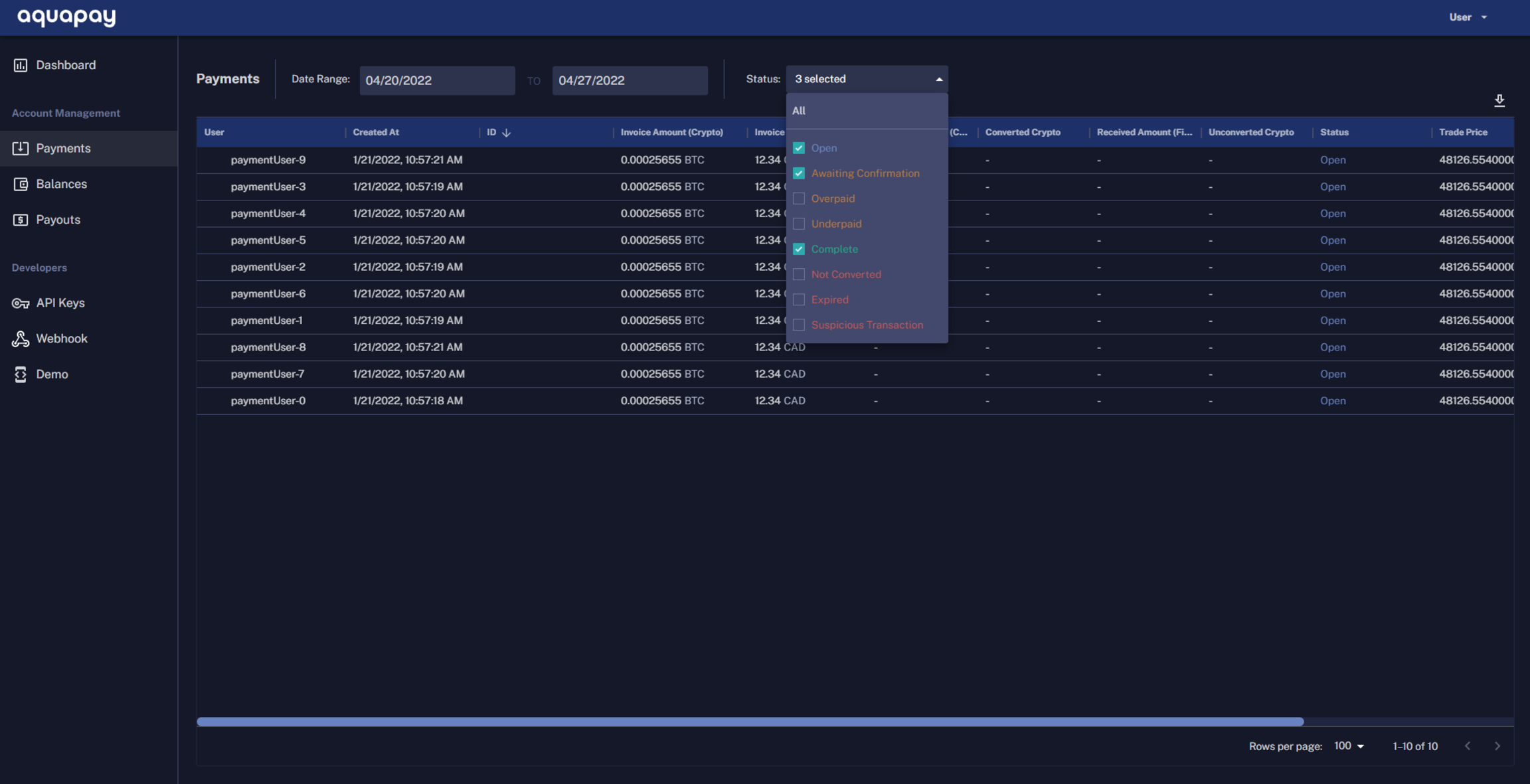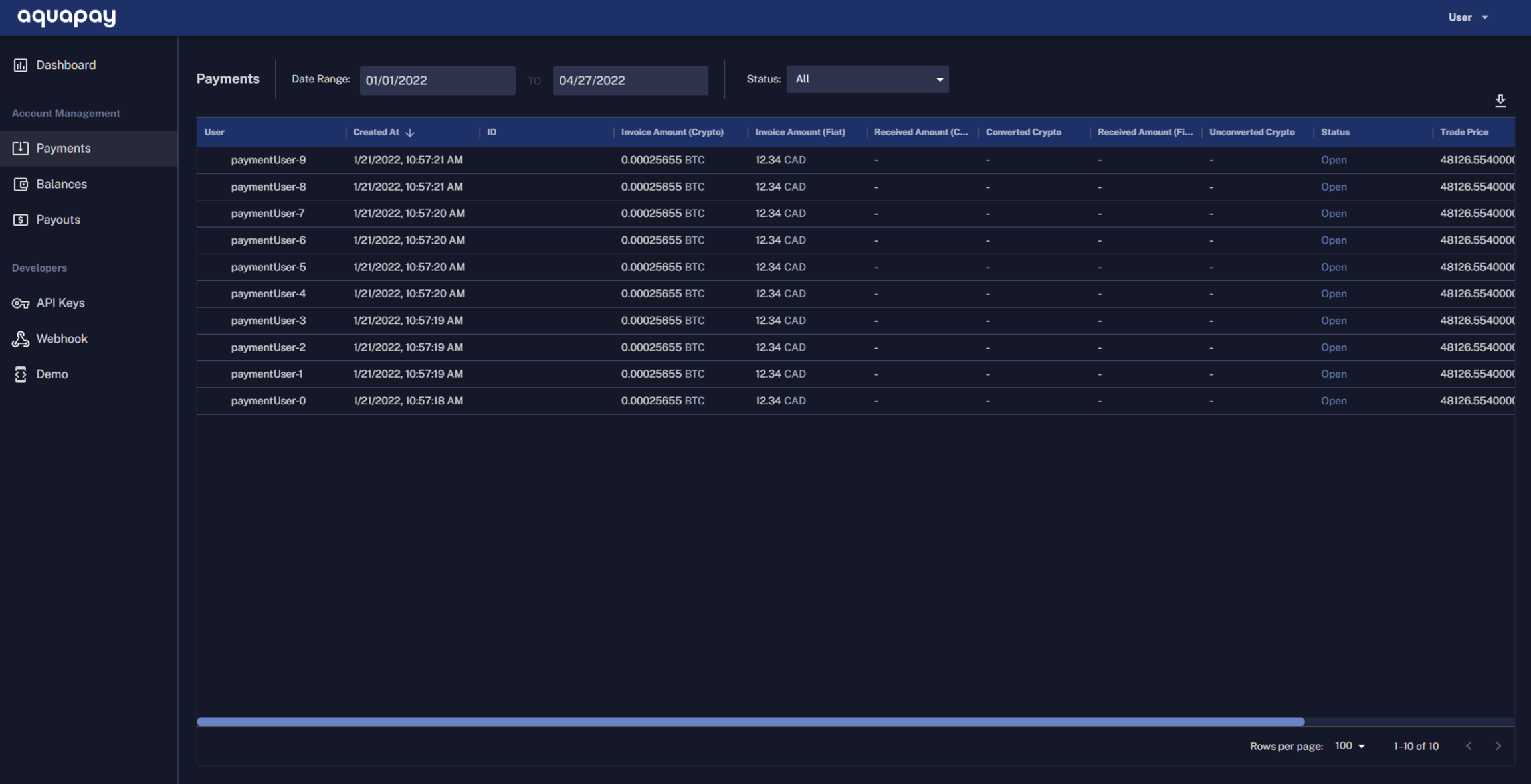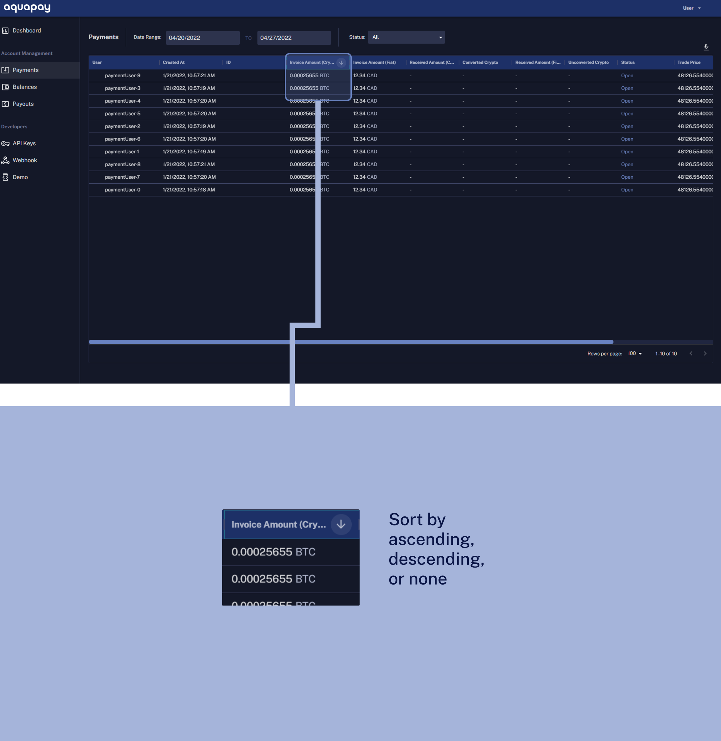 The Payments page displays a table with all your payments. By default, it shows payments in descending creation order.